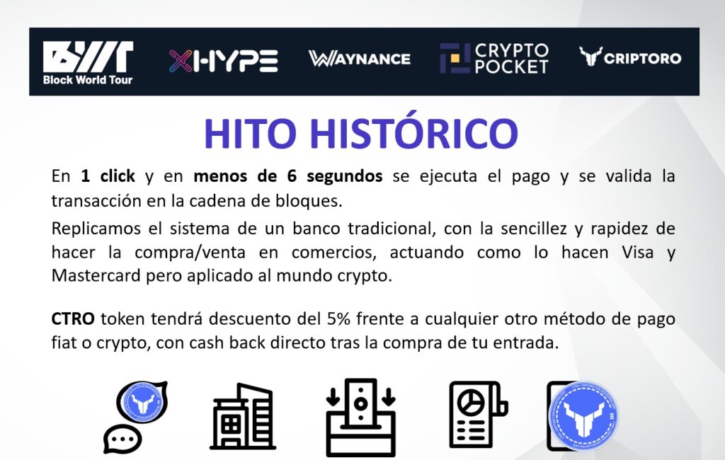 Para el congreso que se celebrará en en Palacio de Congresos de Andorra la Vella, Xhype ha creado una plataforma de compra de entradas descentralizada, para el evento y congreso de BWT en Andorra, donde se incorpora el token de de multi utilidad de Criptoro, CTRO, desde ahora token nativo para pagos de BWT a nivel internacional (con descuento frente a cualquier otro pago fiat o crypto, vía cash back directo al comprador). Quien aun no posea CTRO, podrá adquirirlo directamente en CryptoPocket, ramp on con Licencia y que cumple MiCA, una de las mejores ramps internacionales en estos momentos, con enlace directo desde la plataforma. Waynance Pay y su pionera tecnología de pagos, será quien dentro de esta unión de empresas descentralizadas, proporcione la compra que además será trazable, a través de su TPV virtual de pagos, descentralizado.