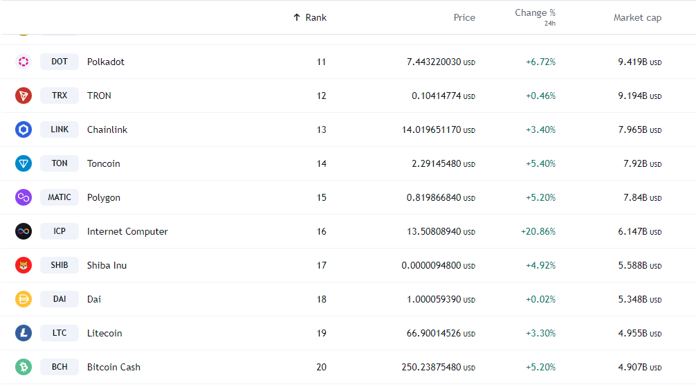 Del top 11 al top 16, Polkadot (DOT), Tron (TRON), Chainlink (LINK), Toncoin (TON), Polygon (MATIC) y Internet Computer (ICP), son todas blockchains.