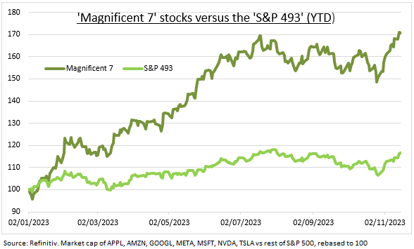 Los «7 magníficos», grandes valores tecnológicos de EE.UU., han subido un 11% desde su mínimo de octubre, el doble que el resto del S&P 500, impulsados por la bajada de los rendimientos de los bonos y sus elevadas valoraciones. Pero el repunte también demuestra que la adopción de la IA es fuerte y que su impacto se está ampliando.