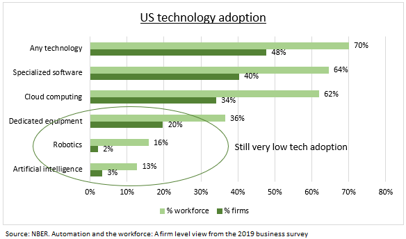 TECNOLOGÍA: Un estudio en profundidad sobre la adopción de las nuevas tecnologías por parte de las empresas estadounidenses, incluida la IA, la robótica, el software especializado y la computación en la nube, muestra que la adopción aún es relativamente baja. Esto implica un largo camino de crecimiento para los proveedores de tecnología.