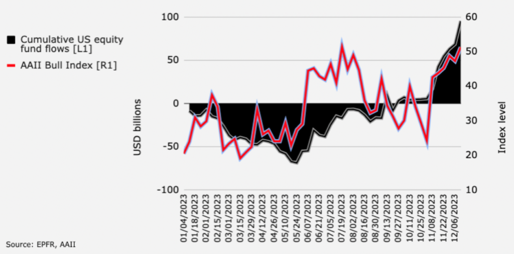 En este punto es importante reseñar la señal de alarma que observamos del lado de complacencia. Los fondos monetarios en USA experimentaron salidas de capital durante la semana hasta el 13 de diciembre, lo que sugiere un inicio de rotación de efectivo hacia activos de mayor riesgo, como las acciones. No olvidemos que actualmente existen más de 6 billones de USD en monetarios, superando los 1,3 billones el monto ingresado solo en 2023.