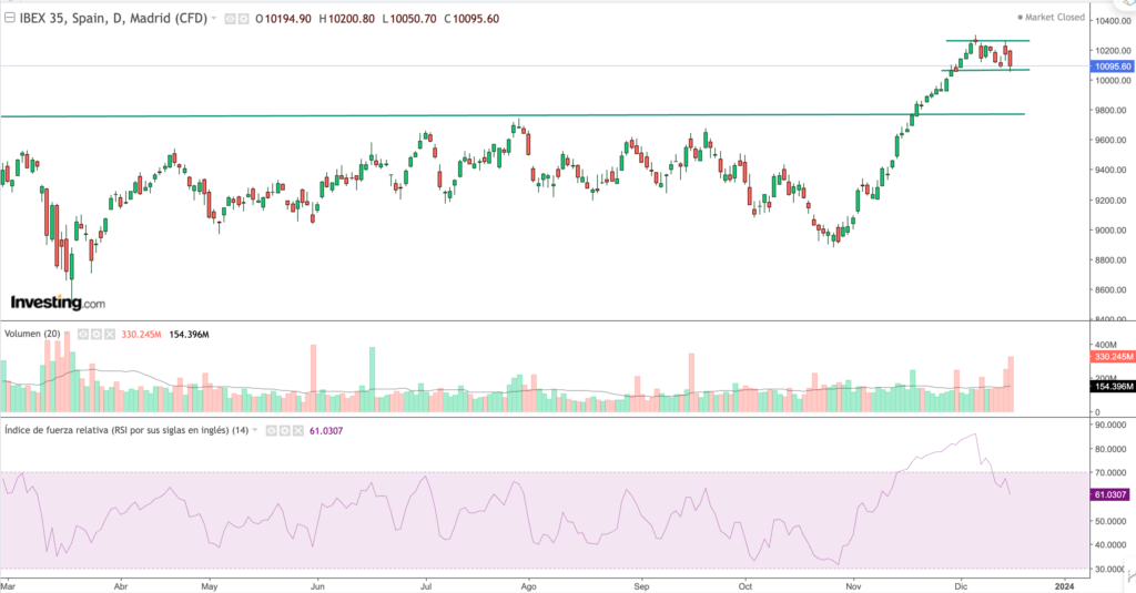 Desde un punto de vista técnico el Ibex ha dado los primeros síntomas de agotamiento. Si bien es verdad que apreciamos rotación sectorial, con los bancos perdiendo posiciones frente a energéticas, la zona de los 10250 se consolida ahora como el primer techo de mercado. El objetivo bajista, de perderse los 10060 puntos lo establecemos en los 9900 primero y en los 9800 como zona importante de control.