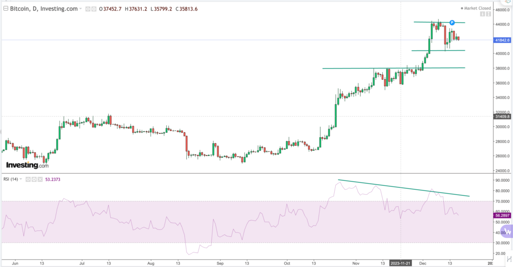 Desde un punto de vista técnico, movimiento de consolidación entre los 40.000 y los 44.000USD. En ese rango de precios estamos viendo una lucha entre alcistas y bajistas al tiempo que la narrativa sobre los ETFs y el “halving” se va acercando a sus tiempos. Antes del 10 de enero tenemos que saber qué sucede con ese primer ETF spot que tanta importancia parece tener para los inversores. Nosotros seguimos a los precios, única pista válida, y mientras estemos en ese rango no operamos. Por arriba si supera los 44.000 iremos directos a la zona 48.000- 50.000USD. Por abajo, objetivo en los 38.000USD primero y los 31.500 USD como siguiente referencia importante.