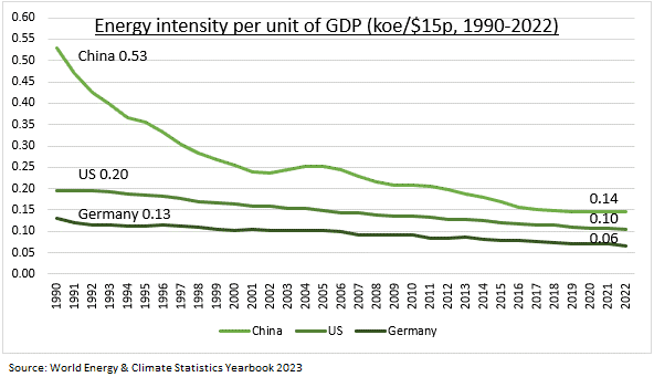 INTENSIDAD: Según Enerdata, la energía necesaria para producir una unidad de PIB ha disminuido aproximadamente un 1,5% al año durante décadas, impulsada por el cambio tecnológico, la eficiencia en la producción y el cambio hacia los servicios. La mejora de Estados Unidos, China y Alemania ha sido del 63% en los últimos 30 años (ver gráfico).