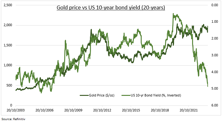 GEOPOLÍTICA: El oro ha sido el refugio más seguro en medio de la creciente incertidumbre geopolítica y el gran muro de la preocupación, beneficiándose de su falta de riesgo crediticio, su correlación negativa con los activos de riesgo y su trayectoria milenaria. Su ascenso de nuevo hacia los 2.000 dólares por onza ha superado a otros refugios tradicionales como el dólar estadounidense y, sin duda, los bonos. Este movimiento ha roto drásticamente la antigua correlación del oro de rendimiento cero con los rendimientos reales y nominales de los bonos estadounidenses (véase el gráfico). Esto introduce cierta vulnerabilidad a corto plazo para el oro si se enfrían los riesgos geopolíticos. No obstante, las perspectivas más generales se ven respaldadas por la probabilidad de que los rendimientos de los bonos bajen y el dólar se debilite en los próximos meses, en un contexto de fuerte demanda continuada de los bancos centrales.