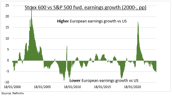 EUROPA: La temporada de resultados del cuarto trimestre en Europa acaba de empezar y merece la pena seguirla de cerca. Están entre los más deprimidos del mundo y los más sensibles a cualquier noticia menos mala. Es probable que el crecimiento de los beneficios en Europa haya caído en picado el trimestre pasado y la historia demuestra que liderará cualquier recuperación mundial. La economía europea ya es débil, sus mercados bursátiles son cíclicos y sus valores tienen bajos márgenes de beneficio, un elevado endeudamiento y están globalizados. Esto ha llevado el crecimiento relativo de los beneficios a niveles muy deprimidos frente a EE UU (véase el gráfico). Pero mantiene la esperanza de un fuerte repunte a medida que los PMIs regionales empiecen a estabilizarse y comiencen los recortes de tipos del BCE. Los beneficios del cuarto trimestre comienzan con fuerza, desde Richemont hasta ASML.