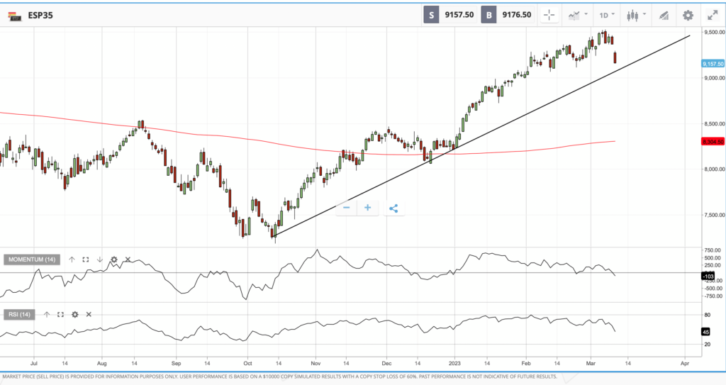 Desde un punto de vista técnico, pérdida del soporte de los 9250 y objetivo en los 9100. Si esa zona se pierde, la caída puede prolongarse hasta los 9000 primero y los 8880-8900 puntos después.