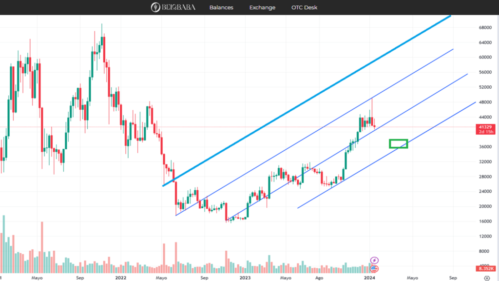 Bitcoin está en resistencia de ultracorto plazo y «la lógica» lo manda a testeo de 36/37K. Que lo haga o no, lo dejamos para el futuro, teniendo en cuenta, que precisamente a futuro, el precio debería acaba subiendo y tocar también la línea azul más gruesa que he pintado también en este análisis.