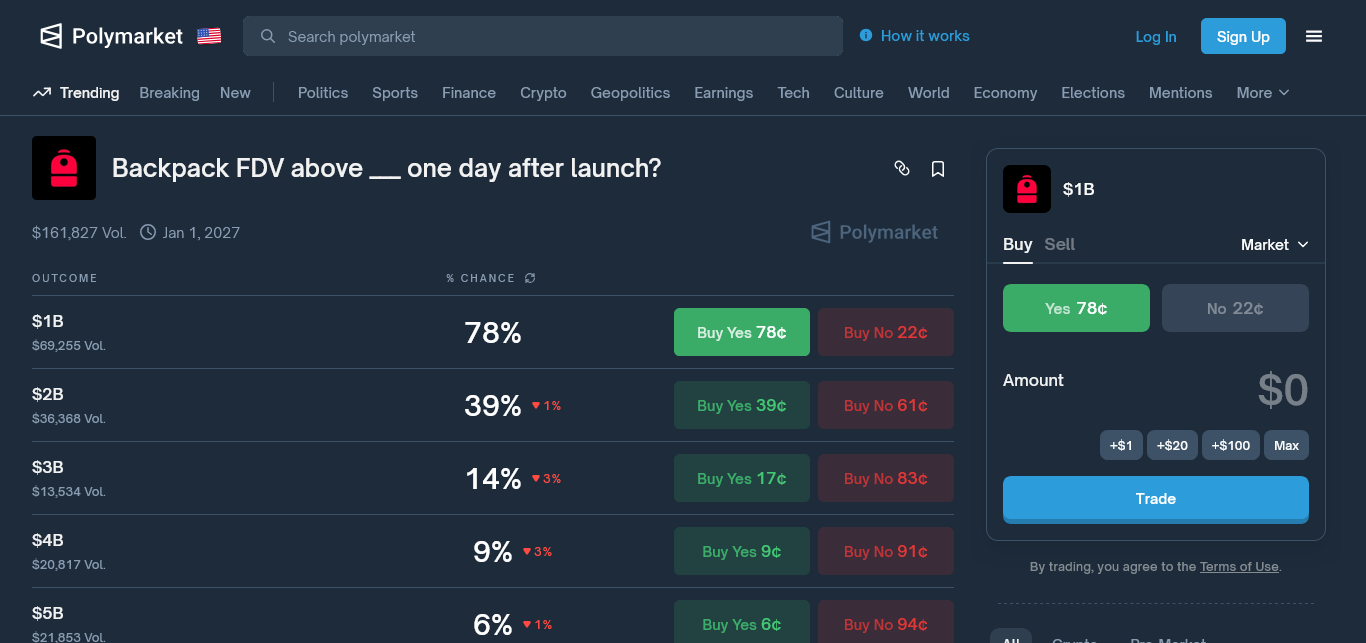 Este rendimiento financiero ha alimentado el optimismo en plataformas de predicción como Polymarket, donde se han abierto dos mercados específicos para especular sobre el lanzamiento del token de Backpack y su Valoración Totalmente Diluida (FDV).