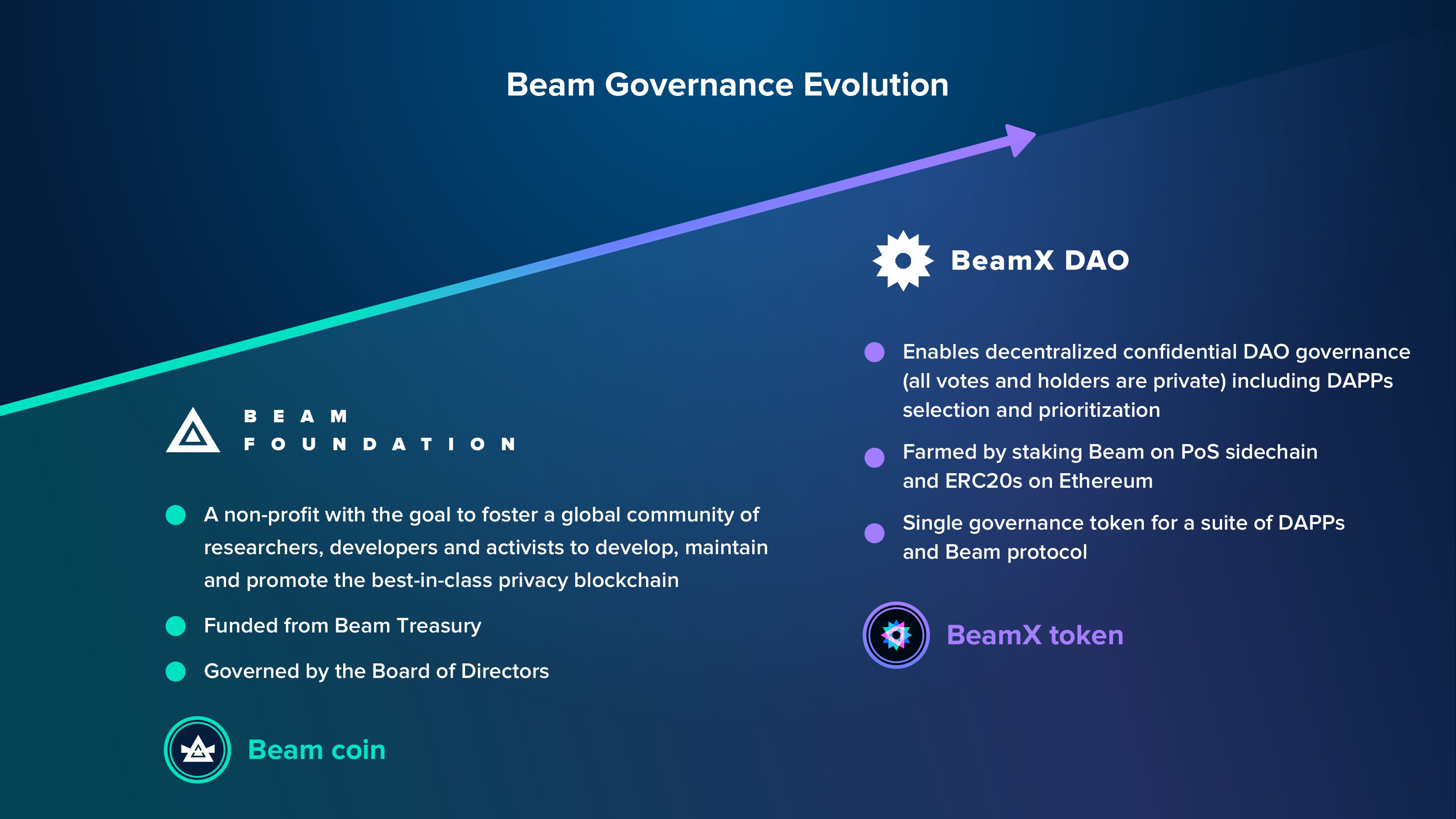 Beam Governance está pasando de Beam Foundation a BeamX DAO . BeamX, el token de gobernanza dedicado, se emitirá y distribuirá como un activo confidencial en la cadena de bloques Beam para supervisar y potenciar el DAO de BeamX.