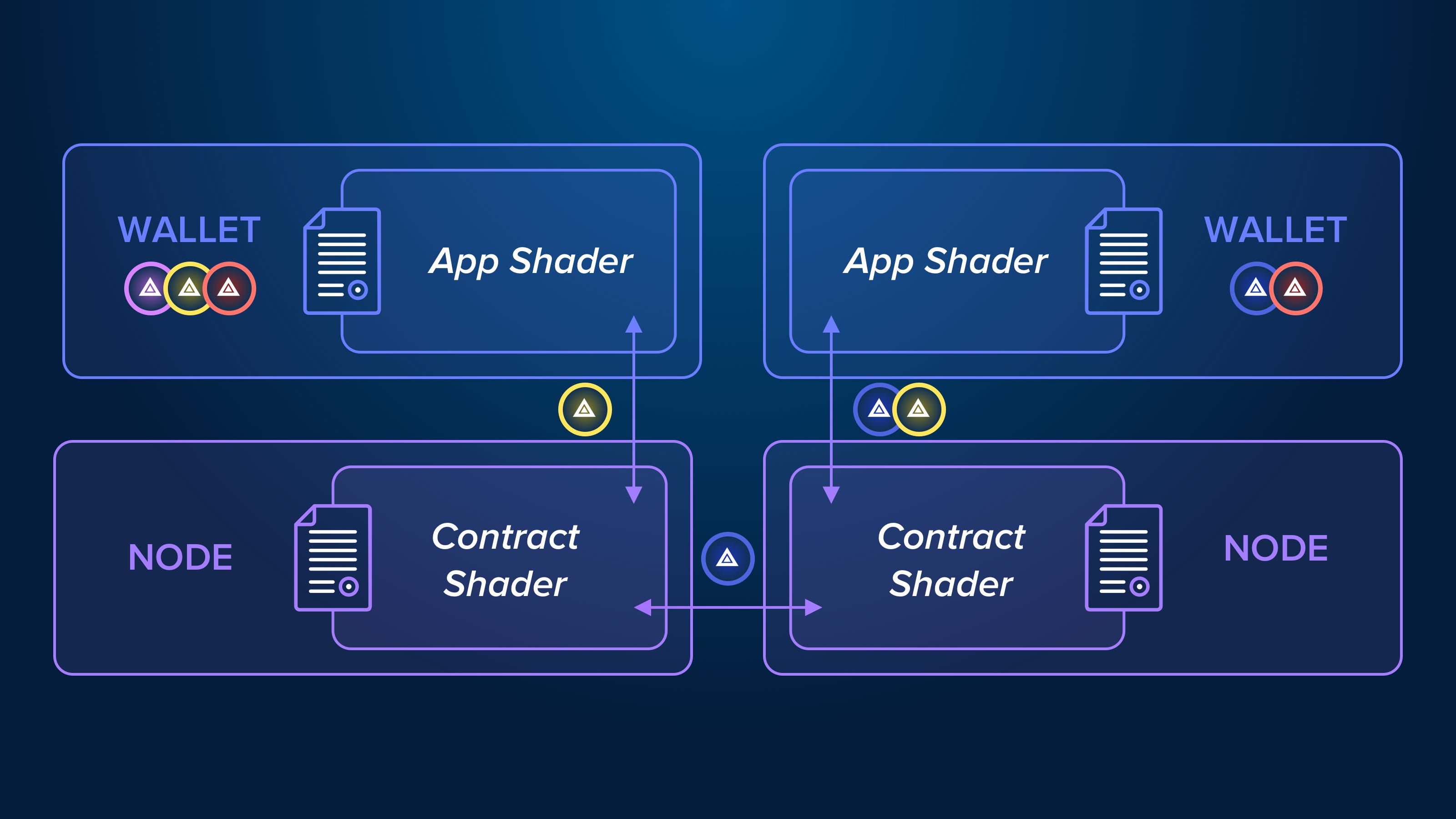 Conoce los sombreadores, hay dos tipos de ellos. Los Contract Shaders sirven para realizar cambios en el estado de la cadena de bloques. Mientras que los App Shaders pueden consultar cualquier información, leer el estado de todos los contratos implementados y solicitar a los usuarios que ejecuten transacciones. Con más detalle: