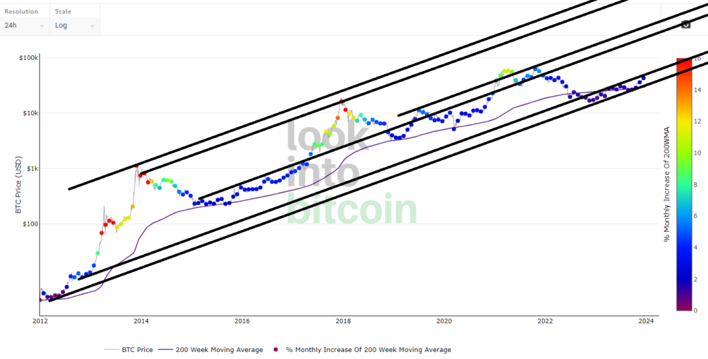 Dependiendo del aumento % mes a mes del promedio móvil de 200 semanas, se asigna un color al gráfico de precios.