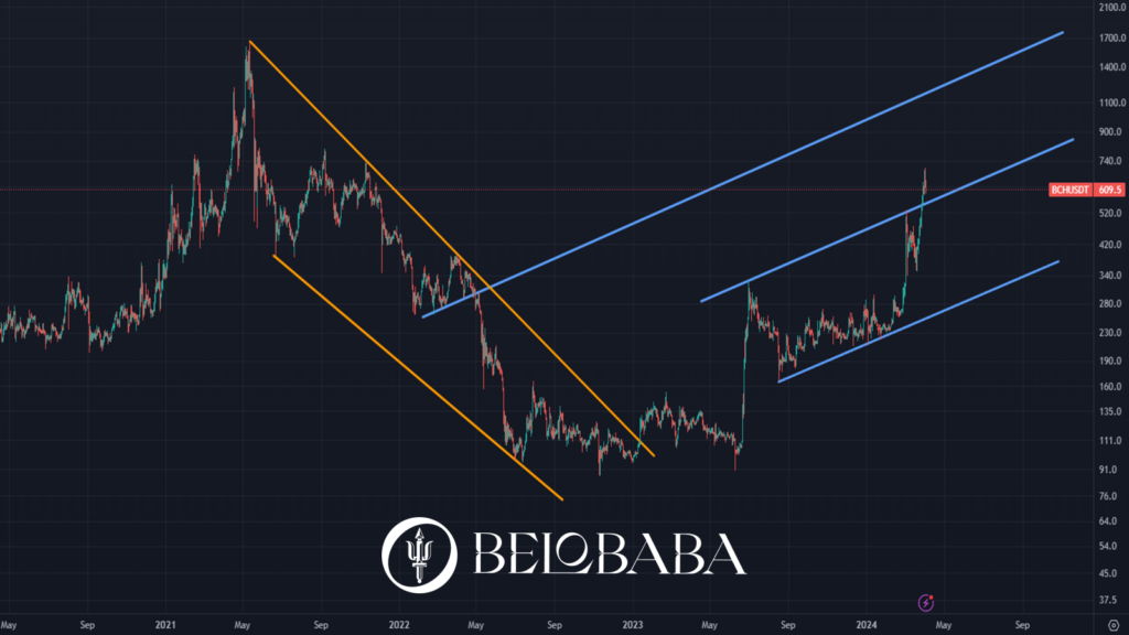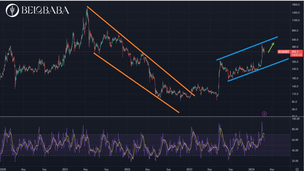 Observo cómo el precio del BCH se ha lanzado en los últimos meses, en una tendencia alcista, y ha creado un canal ligeramente ascendente (marcado con dos líneas paralelas en azul). En el pasado, también marqué el canal bajista de su cripto invierno y el giro alcista producido.