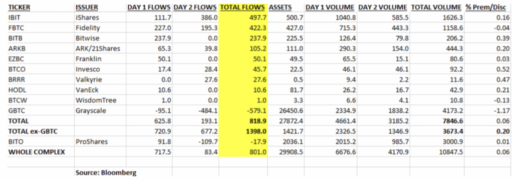 Según la información publicada por Bloomberg, el total de entradas netas en los ETF de BTC en las primeras dos sesiones de negociación, ha sido de unos 810 millones de USD. Las entradas de iShares y Fidelity contrarrestaron las salidas de GBTC y el total activos sin contar a este último quedó en 1420 millones de USD. El volumen contratado quedó por encima de los 3673 millones de USD sin GBTC y se observó cierto interés por este tipo de activos tan esperados.