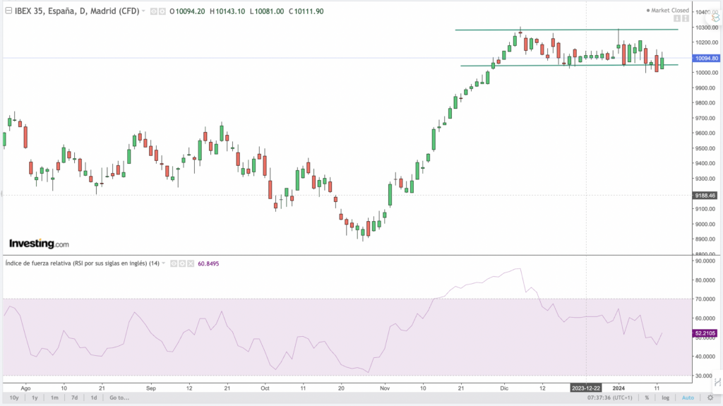 Desde un punto de vista técnico y tras varios intentos de ataque a la zona inferior del canal de consolidación que estamos viendo, seguimos aún dentro del rango delimitado por los 10000-10250. Perder los 10000 supone ir a buscar los 9930 primero y los 9700 como primer objetivo bajista serio. Por arriba, no será fácil romper los 10250 y en caso de hacerlo, primer objetivo en los 10410 puntos.
