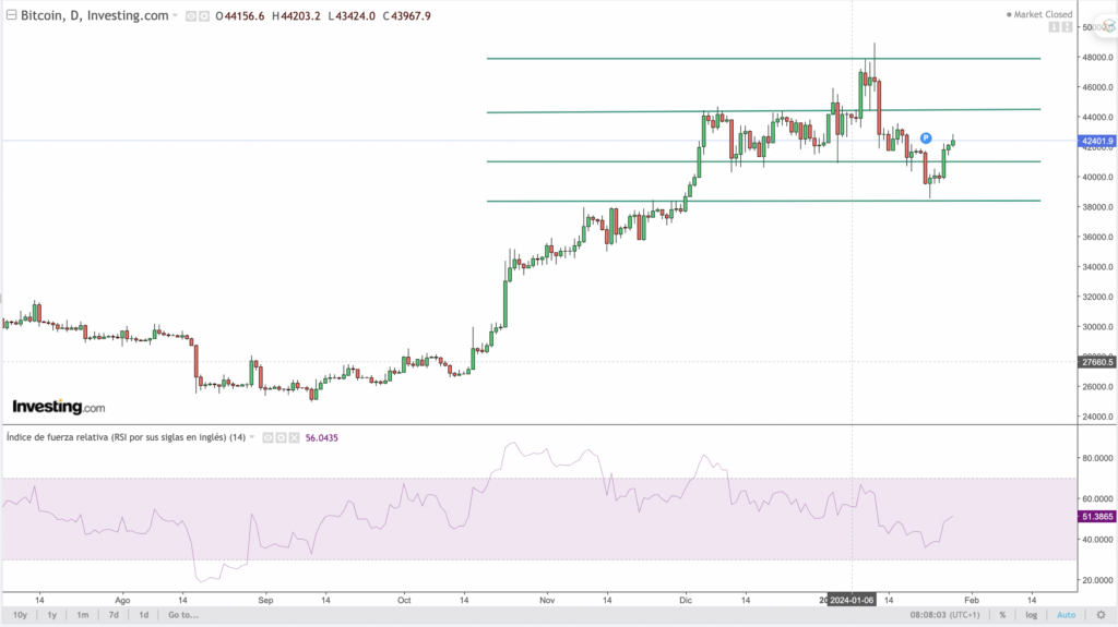 Desde un punto de vista técnico y como marcábamos en el titular, la pregunta clave pasa por saber si podemos establecer los mínimos de la semana anterior, como posible suelo de corto plazo. Tras el lanzamiento de los ETFs y los movimientos de flujos vistos en ese lado, el precio del BTC ha respetado el soporte clave de los 38.000USD y, de momento, pensamos que podemos entrar en un nuevo tramo al alza. Si esa zona se mantiene, tendremos predisposición alcista. Si los precios regresan a esa referencia y la pierden, todo lo contrario. Así que, con esa idea del lado de la zona de control, referencias a vigilar son los 41.000USD como primer soporte y objetivo de este tramo en los 44.000 – 44.500 USD. Esa es ahora la resistencia por batir. Los 48.000 – 48.500 se presentan como techo del actual movimiento a considerar.