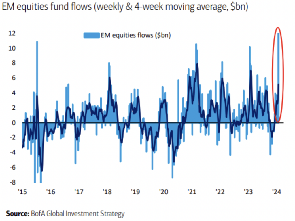 Mientras esto sucede, se observan entradas de 12100 millones de USD en ETFs y fondos mutuos enfocados en mercados emergentes. La posibilidad de una reducción de tipos por parte de la Reserva Federal y los esfuerzos para estabilizar el mercado de valores de China, están impulsando el optimismo sobre las acciones de los mercados emergentes. A pesar de las preocupaciones sobre la desaceleración económica de China, la significativa entrada de fondos en acciones del país sugiere una “apuesta contraria” en busca de activos que, por valoración presentan descuentos sobre los mercados llamados desarrollados. ¿Significa esto que hay que empezar a buscar oportunidades en mercados con múltiplos menores?