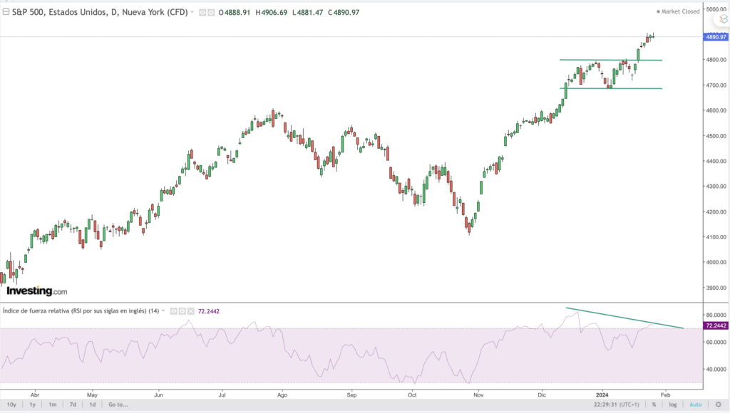Desde un punto de vista técnico y confirmada la ruptura de los 4800 puntos, el índice ha ido a buscar la zona de los 4900 puntos. Esa será una resistencia que batir en un entorno de extrema euforia antes de ir a buscar los 5000 puntos. Las divergencias bajistas indican, cuando menos, cautela. Perder los 4860 supondría ir a por los 4800 puntos y, en caso de perderlos, nos quedan los 4700 como soporte relevante. Mientras estemos por encima la tendencia sigue intacta.