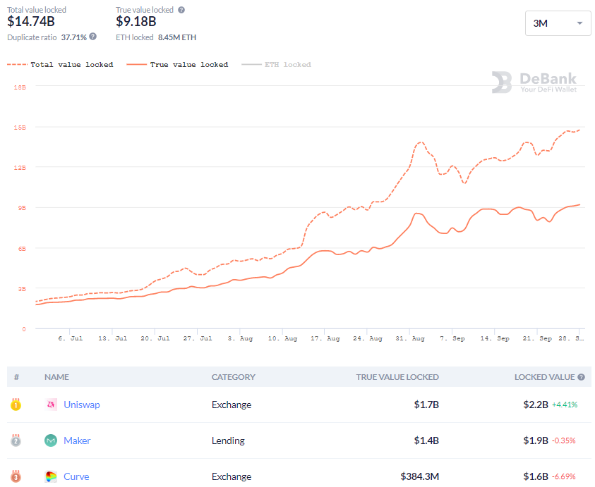 Según DeBank , el intercambio descentralizado Uniswap mantuvo una cifra récord de valor total bloqueado de $ 2.2 mil millones a partir de esta mañana, por delante de Maker ( MKR ) y Curve ( CRV ).
