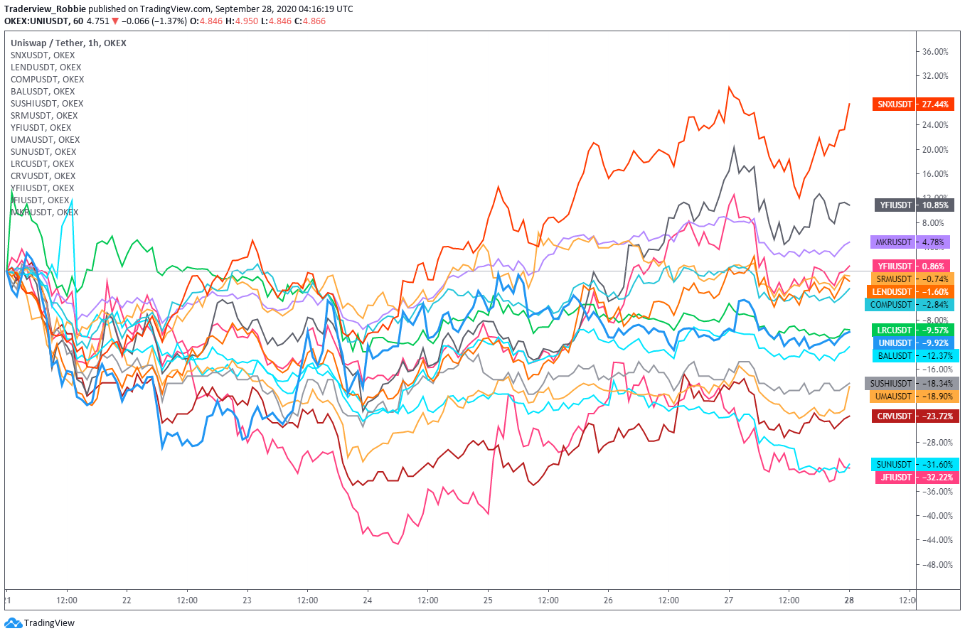 Synthetix ( SNX ) aumentó un 27,44% la semana pasada en medio de la adopción de soluciones de escalado de capa 2. El protocolo está programado para otra implementación de una propuesta llamada Deneb el 29 de septiembre. Mientras tanto, yearn.finance ( YFII ) subió un 10,85%.