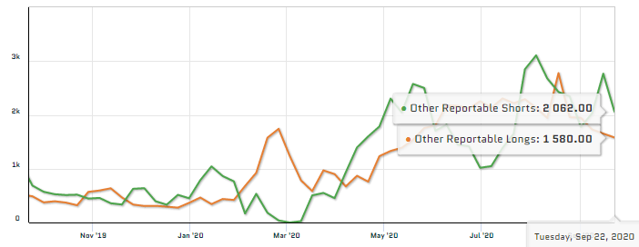 Según el informe, las cuentas de fondos apalancados vieron caer sus posiciones largas de 2.819 a 2.280, mientras que las posiciones cortas cayeron de 5.224 a 4.480. Mientras tanto, en términos de otras cuentas reportables, las posiciones largas cayeron de 1.653 a 1.580 y las posiciones cortas disminuyeron de 2.766 a 2.062. La gran reducción de los cortos probablemente se debió a actividades de toma de ganancias.