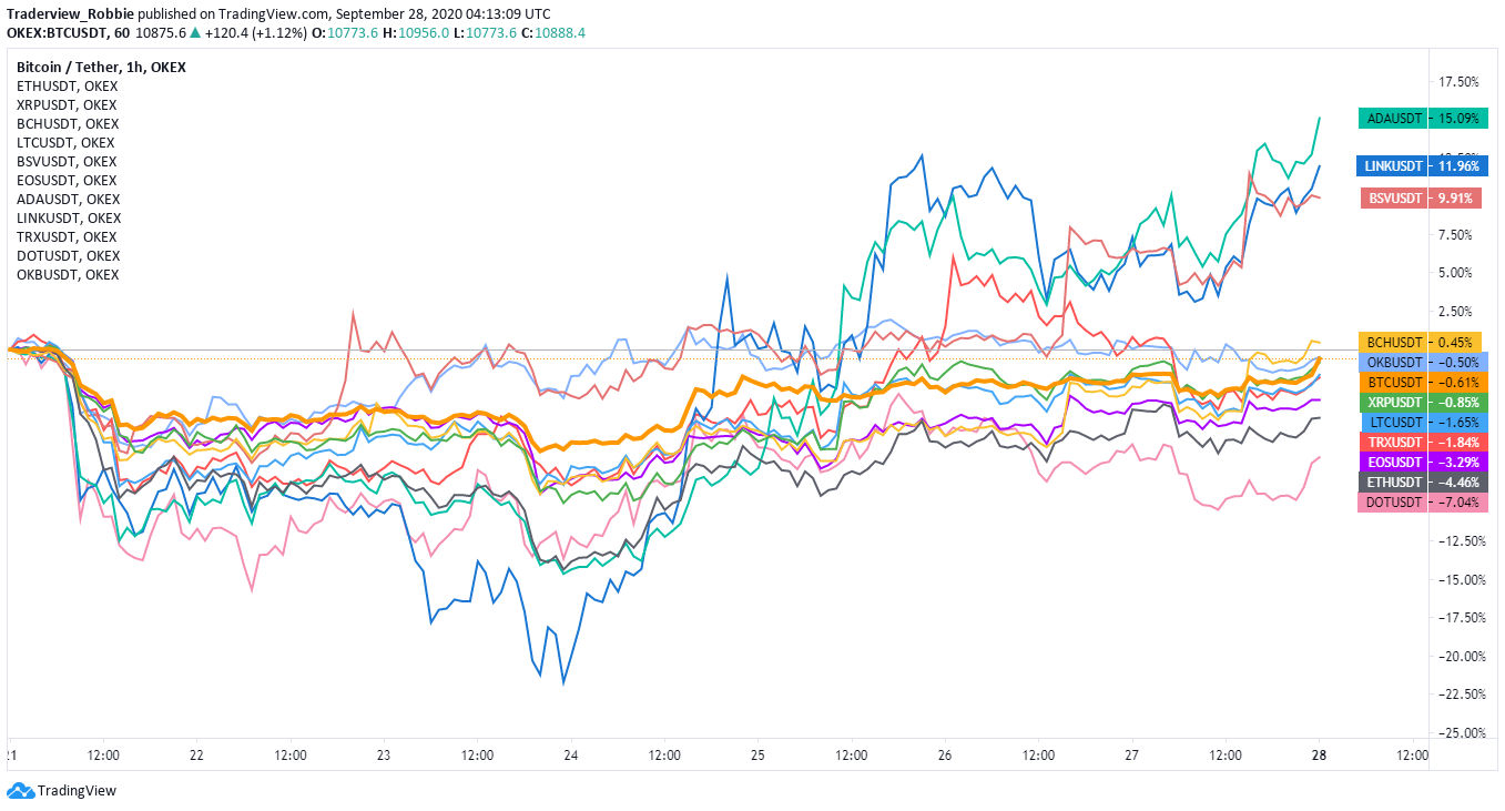Con tres días hábiles para el cierre de este mes, los mercados financieros están ahora cada vez más impulsados por la política global del banco central en lugar de por los fundamentales. El riesgo alcista de un dólar más fuerte está ejerciendo presión sobre los precios de muchos activos, lo que hace que el índice S&P 500 registre su cuarta semana consecutiva de caídas. Mientras tanto, el precio del oro también se desplomó desde el precio de apertura de la semana pasada de $ 1,950 a $ 1,860. Sin embargo, en comparación, Bitcoin ( BTC ) cayó solo un 0,61% en la última semana y volvió a superar los $ 10,800 después de un repunte durante el fin de semana, según el precio al contado de OKEx BTC.