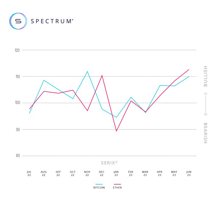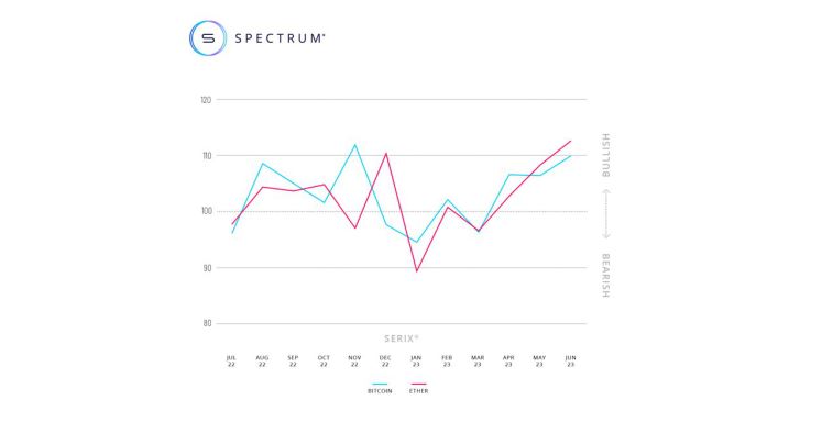 Spectrum Markets (Spectrum), el centro paneuropeo de negociación de derivados titulizados, ha publicado los datos de su índice de sentimiento SERIX para los inversores minoristas europeos correspondiente al mes de junio, que revelan que el sentimiento de los inversores minoristas hacia las criptomonedas Bitcoin y Ether ha mejorado de manera constante desde que el índice alcanzó su punto más bajo en enero de 2023.