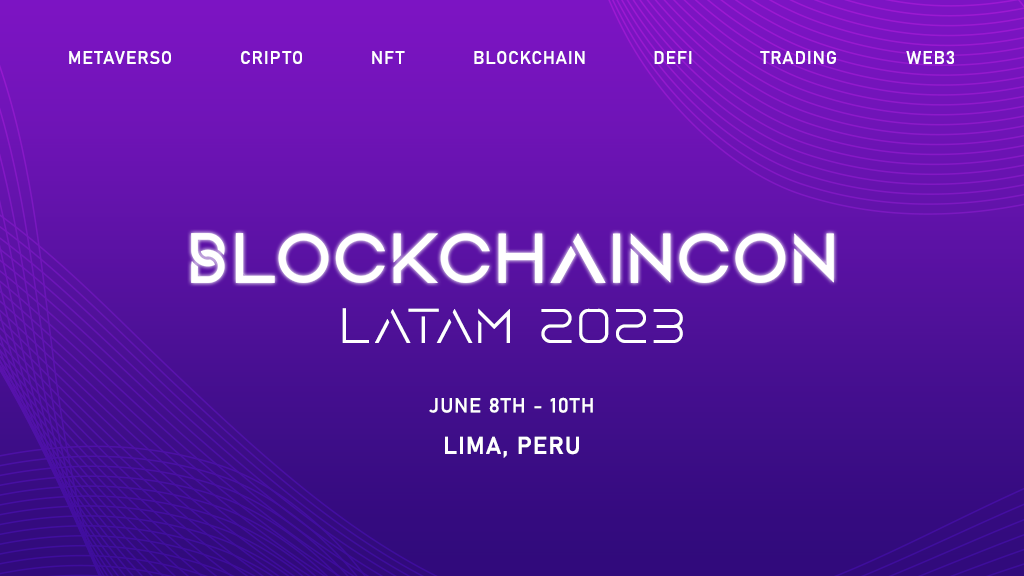 Blockchaincon Latam se realizará el 8, 9 y 10 de junio en el Lima Centro de Convenciones (LCC). El encuentro se centrará en abordar temas relacionados con la tecnología blockchain, crypto, NFT, metaverso, Inteligencia Artificial (IA), trading, finanzas descentralizadas (DeFi) y el desarrollo de la Web3.