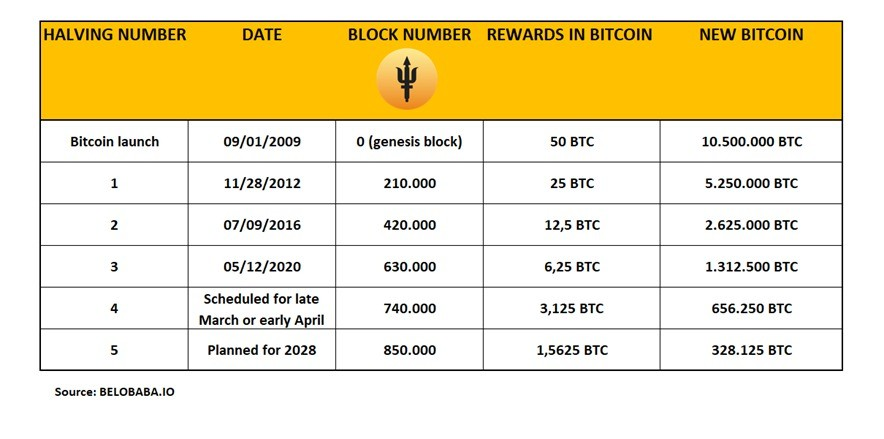 En la siguiente tabla realizada por BELOBABA, podemos ver las fechas de los halvings y recompensas en bloque, fechas pasadas y las dos próximas. Incluye el número de bloque y los nuevos bitcoins emitidos.