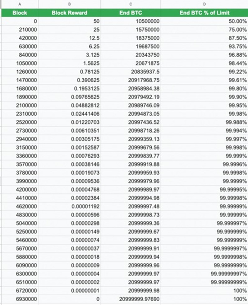 Todos los bitcoins a minar y cuando se minarán por situación de bloque, tanto los pasados como los futuros y todos los bloques, bloques de recompensa, en los que se cambia BTC del halving promedio y también el porcentaje del límite de bitcoin, para que tengamos una imagen completa de lo que está por venir, hasta el último halving, en el bloque 6.930.000, donde la recompensa de bloque, será 0 BTC.