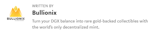 Bullionix es un acuñador de moneda de oro descentralizada donde USTED es el orfebre. Usted elige el molde de fundición, derrite el oro y posee el objeto coleccionable digital resultante para exhibirlo, compartirlo o venderlo. Todo impulsado por el estándar NFT de Ethereum y el oro inteligente de Digix .