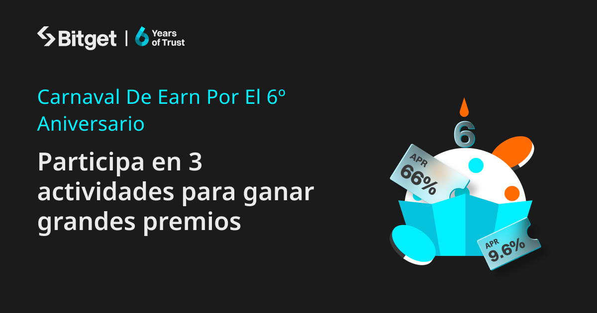 Para celebrar el 6º aniversario de Bitget y mostrar nuestro agradecimiento por el continuo apoyo de nuestros usuarios, Bitget Earn pone en marcha el Carnaval de Earn por el 6º Aniversario de Bitget. Puedes ganar cupones de suscripción exclusivos por nuestro aniversario con una tasa de interés del 66% y suscribir productos de Earn con un APR de hasta 9,6%. Y muchos más regalos te esperan. ¡Únete ahora!