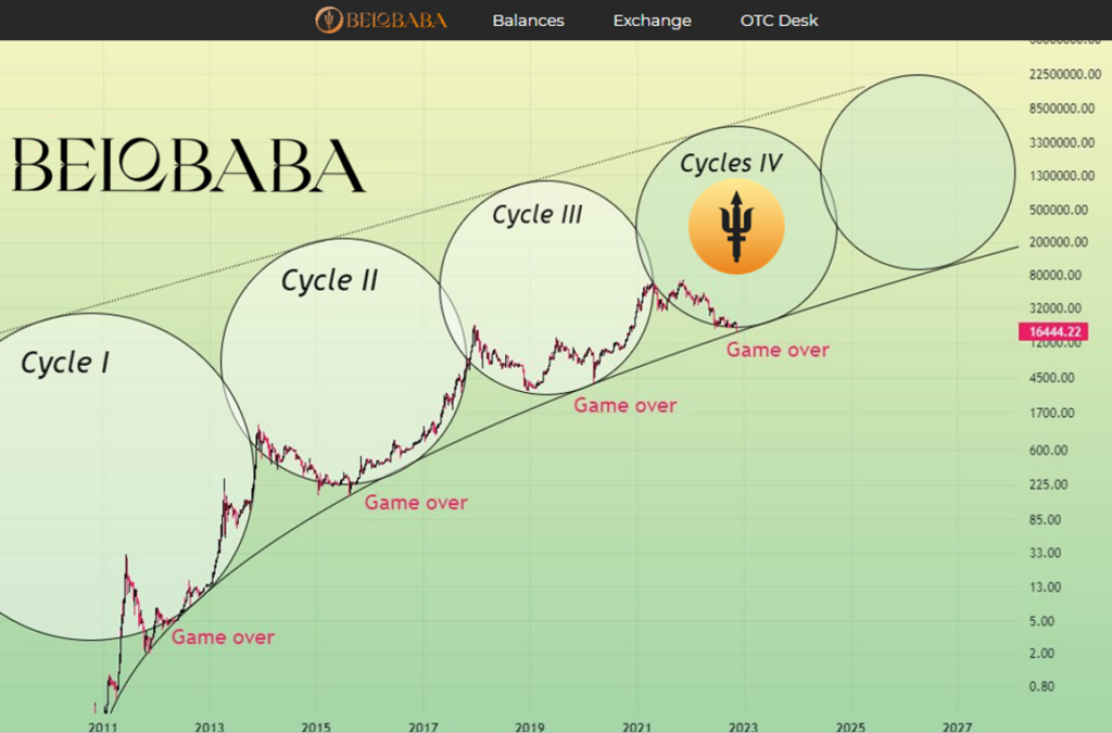 En el siguiente gráfico observamos los 4 ciclos de bitcoin a fecha (estamos en zonas de salida del punto central del ciclo cuarto). La zona de mínimos de noviembre de 2022 se antoja importante como zona final de teórica caída del último cripto invierno.