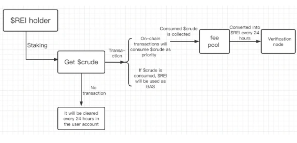 El $Crude consumido por los usuarios todos los días se recolecta en el grupo de tarifas, que se convierte uniformemente en $REI cada 24 horas y se distribuye a cada nodo de acuerdo con la proporción de paquetes de bloque.