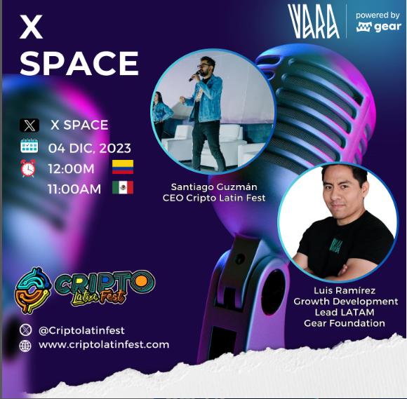 Santiago Guzmán, CEO de Cripto Latin Fest, y Luis Ramírez, Growth Development Lead de LATAM GEAR FOUNDATION, se unen para presentar un evento sin precedentes que sacudirá el mundo de las criptomonedas. Este 4 de diciembre de 2023, prepárate para sumergirte en un espacio exclusivo en X Space junto a destacados influencers del cripto mundo: @varanetwork_es, @elcriptoparcero, @robertosteam, y @donatello.eth.