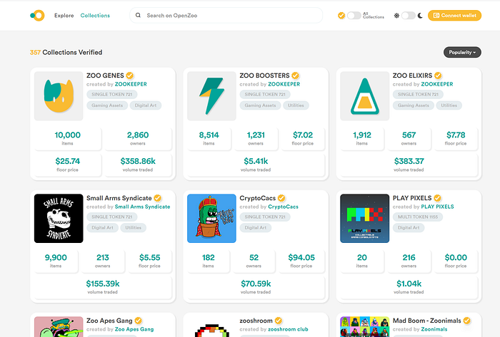 Por el contrario, otros mercados, como OpenZoo , usan contratos inteligentes separados para cada colección. Debido a esto, el puente NFT de Wanchain muestra cada colección individualmente, ya sea Zoo Genes, Zoo Boosters, Small Arms Syndicate, CryptoCacs u otros.