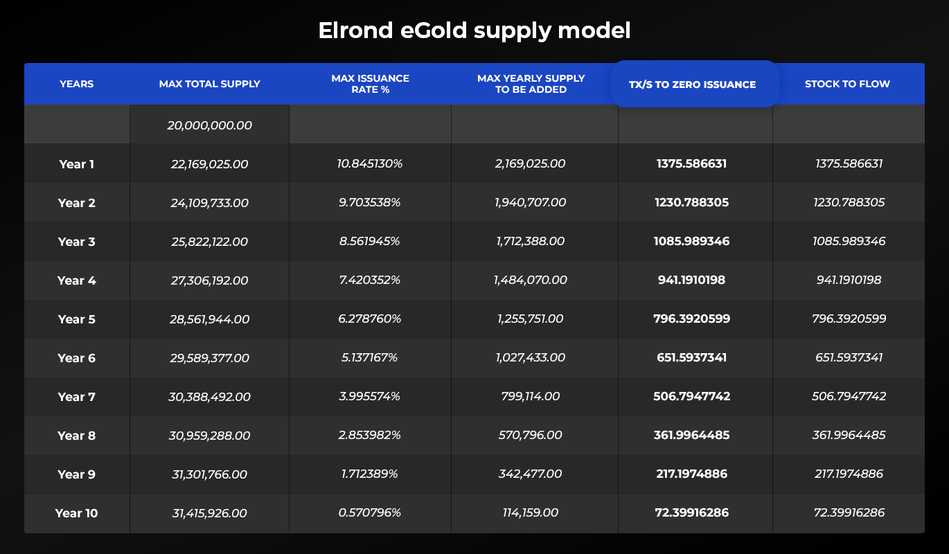 En Elrond, el suministro comienza en 20.000.000 y muestra un aumento temporal predecible en el suministro para incentivar la seguridad de la red mediante recompensas de participación. El suministro máximo definido no puede exceder los 31,415,926 en un lapso de 10 años. Sin embargo, este límite teórico en realidad disminuirá con cada transacción procesada y las tarifas generadas. Por lo tanto, cuanto más fuerte sea la adopción, menor será la oferta de eGold.