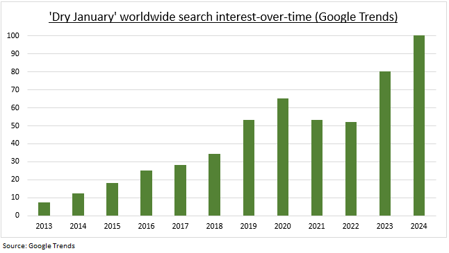 El “Dry January” o “enero seco» se ha hecho más popular (véase el gráfico) impulsado por los bebedores más jóvenes, las tendencias seculares de salud y bienestar y las presiones cíclicas del coste de la vida.