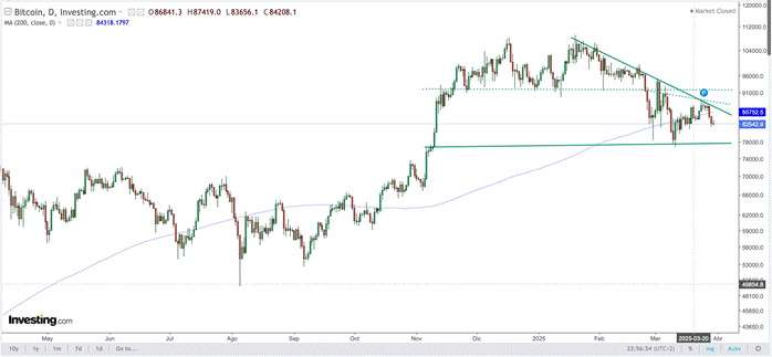 Desde un punto de vista técnico y pese a que seguimos dentro del rango 77000-92000USD, es evidente la debilidad semanal donde bitcoin ha vuelto a perder la media de 200 sesiones que ahora pasa por los 85600USD. Hasta que no veamos precios por encima de los 92K no se abriría el camino hacía los 97000USD primero y los 100000USD después. Perder los 80000USD solo nos deja los mínimos vistos hace unas semanas en los 77000USD antes de ir a por los 73.000USD.