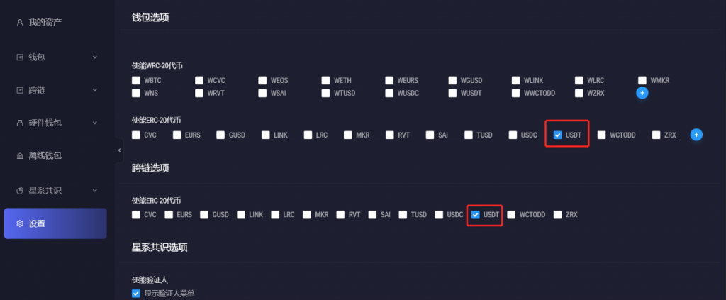 Para usar USDT en la billetera ligera, la opción USDT debe verificarse en la pestaña de configuración: