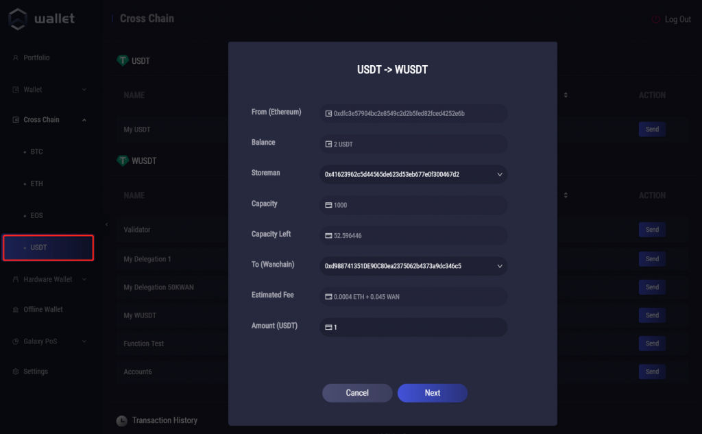 En la interfaz de cadena cruzada, puede transferir fácilmente de USDT a WUSDT. Antes de transferir, asegúrese de que haya suficiente ETH y WAN en cada cuenta respectiva para pagar la tarifa de gas requerida para el proceso de transacción entre cadenas en cada cadena.