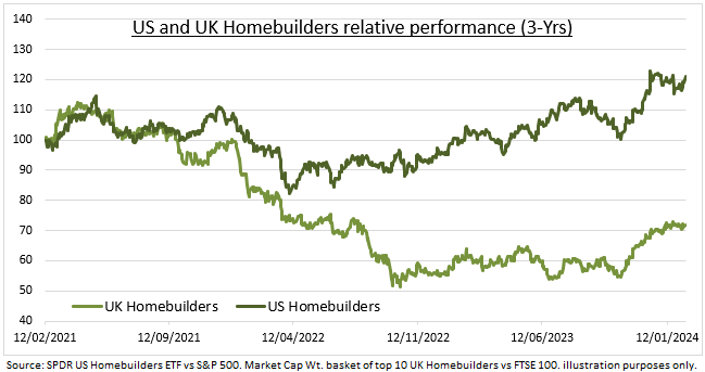 Por su parte, los constructores de viviendas británicos han recuperado terreno recientemente, con los tipos hipotecarios en máximos y las valoraciones descontadas, después de haber obtenido unos resultados muy inferiores. De forma contraintuitiva, los constructores estadounidenses se benefician de unos tipos hipotecarios más altos, mientras que los británicos necesitan que sigan bajando.