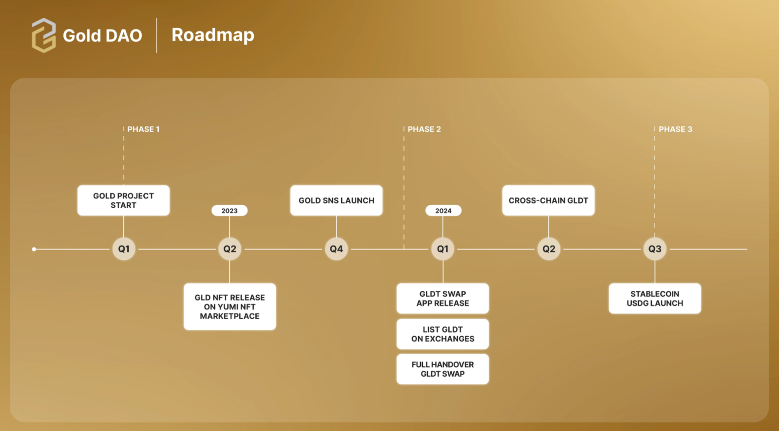 La hoja de ruta de Gold DAO no es simplemente una línea de tiempo de eventos, sino una superposición de fases, cada una de las cuales agrega profundidad y utilidad a la anterior.