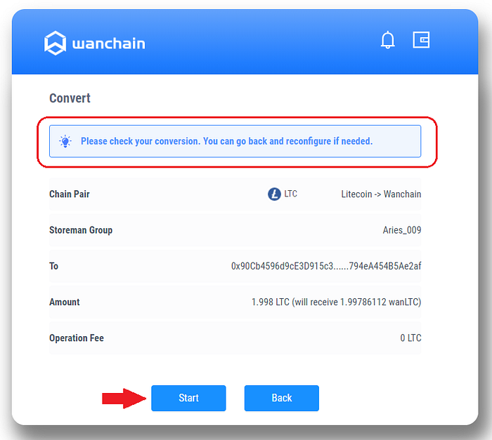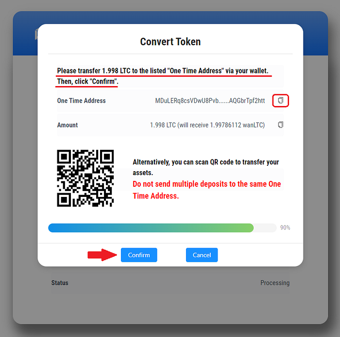 Paso 3: Ingrese la dirección de su billetera Wanchain y la cantidad de LTC que desea convertir. Haga clic en Confirmar.
