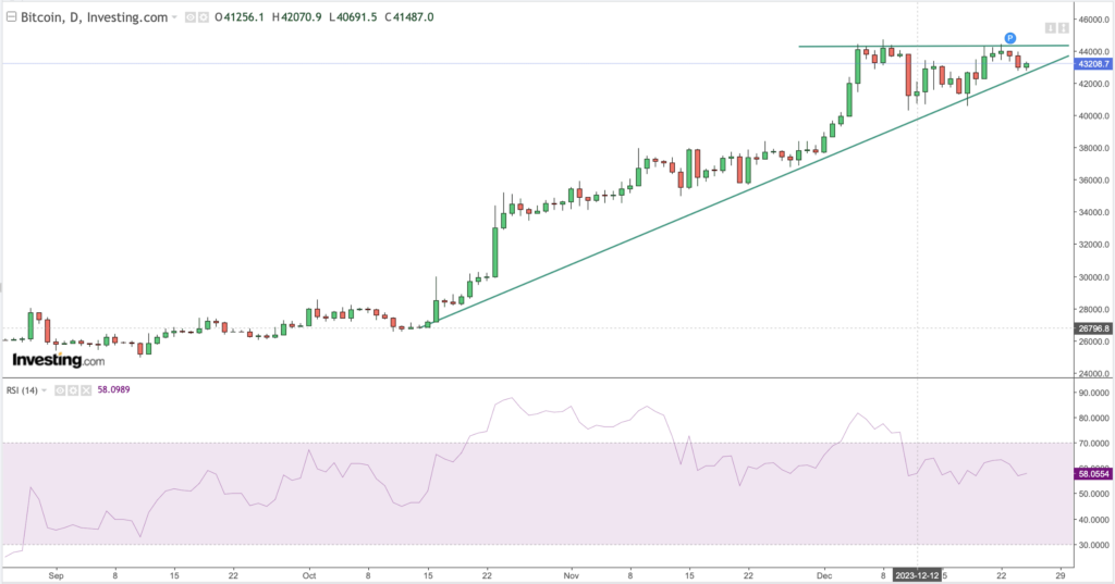 Desde un punto de vista técnico, seguimos en el movimiento de consolidación limitado por los 40.000 y los 44.000USD. Seguimos a la espera de noticias definitivas sobre los ETfs y hemos pasado a un modo “FOMO” donde estamos viendo flujos que van hacia las “Altcoins” que tanto nos recuerdan al final de los ciclos alcistas. Pero… nosotros seguimos a los precios, única pista válida, y mientras estemos en ese rango no operamos. Por arriba si supera los 44.000 iremos directos a la zona 48.000- 50.000USD. Por abajo, objetivo en los 38.000USD primero y los 31.500 USD como siguiente referencia importante.