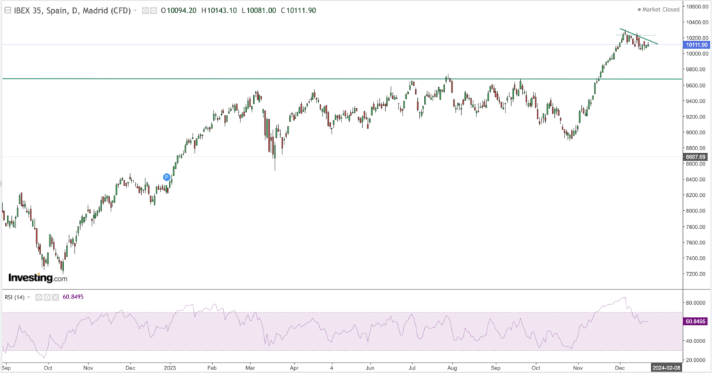 Desde un punto de vista técnico el Ibex sigue consolidando los fuertes movimientos previos. Si los 10.000 puntos aguantan, podemos pasar a movimientos mas estrechos con zona de resistencia en los 10250. La debilidad y agotamiento de sectores como el bancario serán claves a la hora de acentuar un movimiento u otro. Se ha corregido el alto nivel de sobrecompra previo y hará falta ahora entrada de flujos serios para seguir pensando en nuevas alzas.