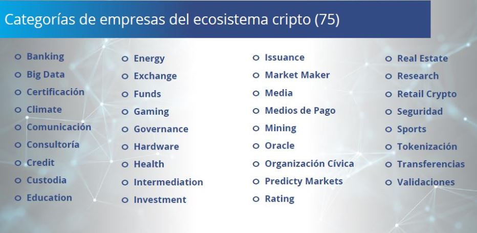 Actualmente, el ecosistema está integrado por 35 categorías distintas: Banking, Big Data, Certificación, Climate, Comunicación, Consultoría, Credit, Custodia, Education, Energy, Exchange, Funds, Gaming, Governance, Hardware, Health, Intermediation, Investment, Issuance, Market Maker, Media, Medios de pago, Mining, Oracles, Organización Cívica, Predicty Markets, Rating, Real Estate, Research, Retail Crypto, Seguridad, Sports, Tokenización, Transferencias y Validaciones.