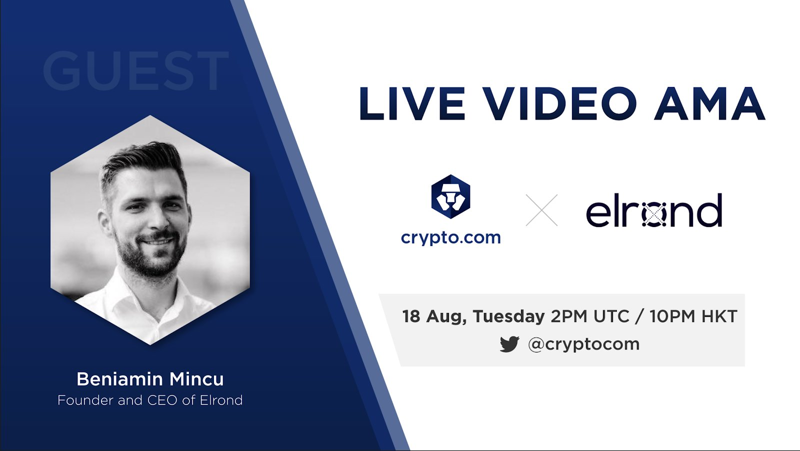 Crypto.com.- El 18 de agosto de 2020, la Vicepresidenta sénior y directora de marketing de Crypto.com, Maggie Ng, tuvo una sesión de Live AMA con Beniamin Mincu, fundador y director ejecutivo de Elrond.