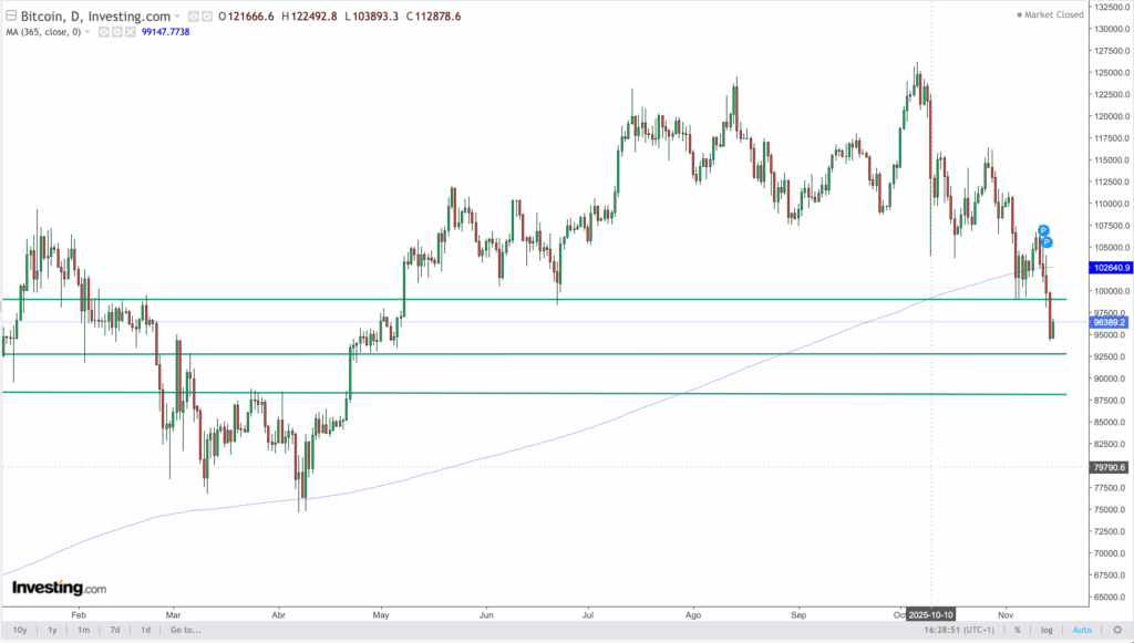 Bitcoin ha perdido momentáneamente la zona de los 100.000 USD y ha perforado los 95.000 USD, situándose por debajo de la media móvil de 365 días. Este movimiento técnico no es menor, pues rompe un soporte estructural que ha sostenido el ciclo desde inicios de 2024 y abre la puerta a un escenario con implicaciones más bajistas.