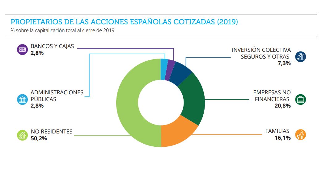 Los inversores no residentes poseían a cierre de 2019 el 50,2% de las acciones cotizadas españolas, según el último informe del Servicio de Estudios de BME. Es el cuarto récord histórico consecutivo y supone dos puntos porcentuales más que el año anterior y diez más que hace una década.